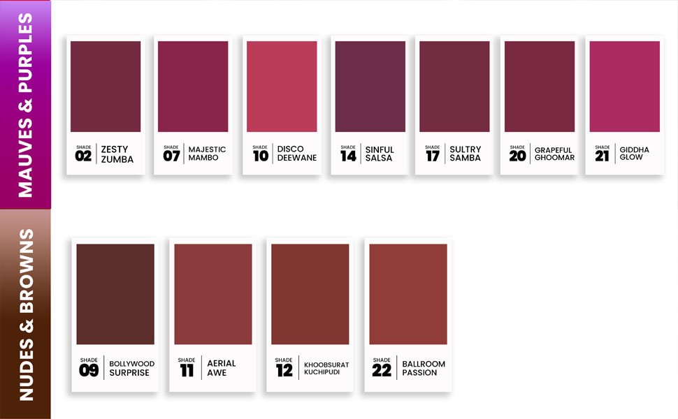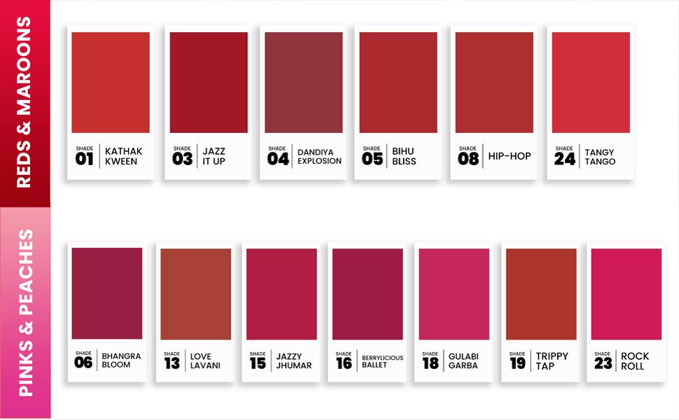 Shade DISCO DEEWANE, AERIAL AWE, KHOOBSURAT KUCHIPUDI, LOVE LAVANI, SINFUL SALSA, JAZZY JHUMAR, BERRYLICIOUS BALLET, SULTRY SAMBA, GULABI GARBA, TRIPPY TAP, GRAPEFUL GHOOMAR, GIDDHA GLOW, BALLROOM PASSION, ROCK N ROLL, TANGY TANGO, KATHAK KWEEN, ZESTY ZUMBA, JAZZ IT UP, DANDIYA EXPLOSION, BIHU BLISS, BHANGRA BLOOM, MAJESTIC MAMBO, HIP-HOP, BOLLYWOOD SURPRISE