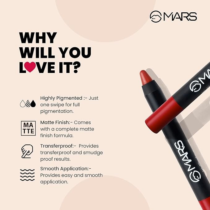 - TRANSFERPROOF: MARS matte crayon is kiss-proof and transfer-proof. These lipsticks are great for everyday use since they last a long time.
